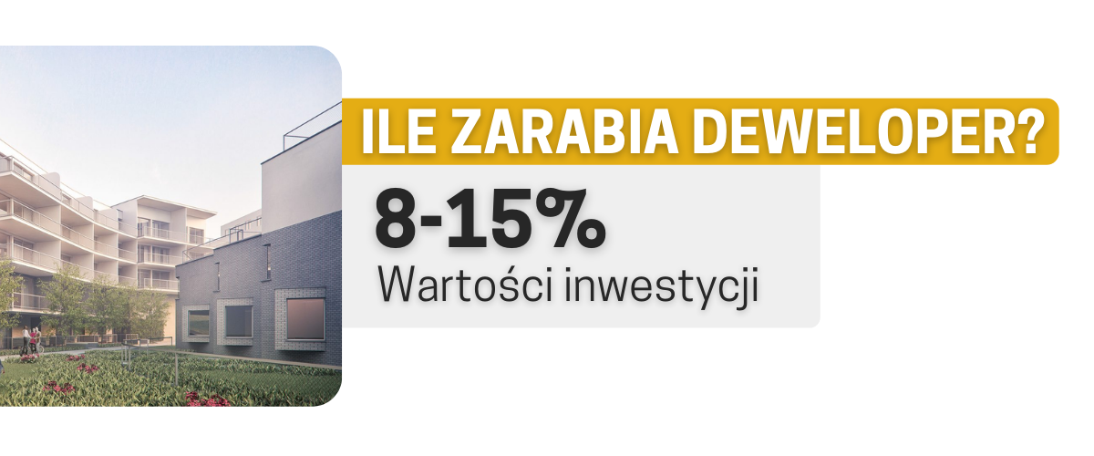 To, ile zarabia deweloper, bezpośrednio zależy od jego wielkości. Marża dewelopera wynosi około 20% wartości nieruchomości. Odejmuje się od tego koszty stałe w wysokości od 5 – 12%. Zysk wynosi więc 8 – 15% wartości inwestycji. Zarobek dewelopera zależy więc przede wszystkim od jej skali.